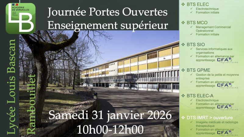 Lycée Louis Bascan - RambouilletSamedi 31 janvier 2026, de 10h à 12h, le lycée Louis-Bascan ouvre ses portes sur les formations d'enseignement supérieur proposées aux étudiants.