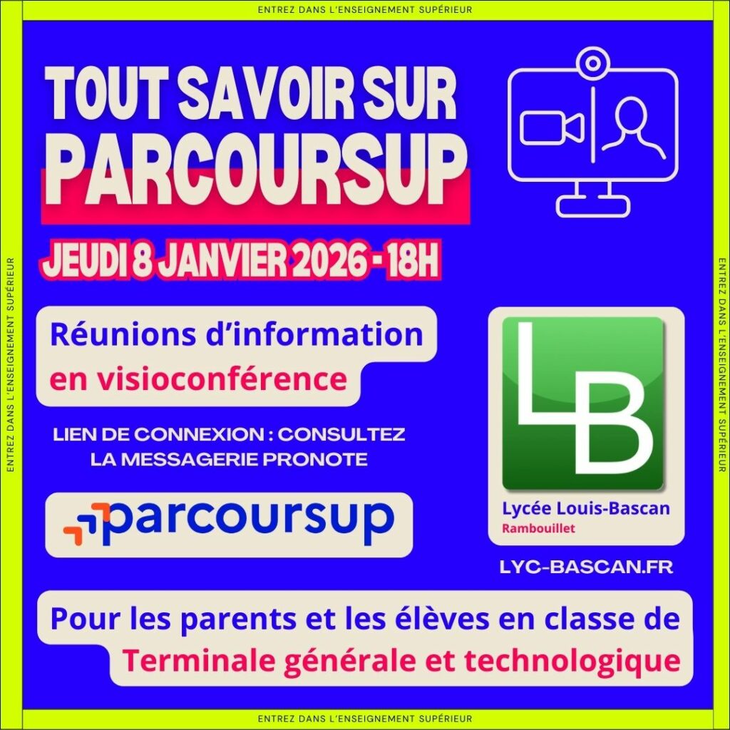 Pour celles et ceux qui n’auraient pas pu assister aux soirées de présentation de la procédure Parcoursup, organisées par la Direction du lycée Louis-Bascan, nous mettons à disposition toutes les ressources diffusées lors des visioconférences qui ont eu lieu du 11 au 14 janvier 2021. Nous vous en souhaitons bonne consultation.
