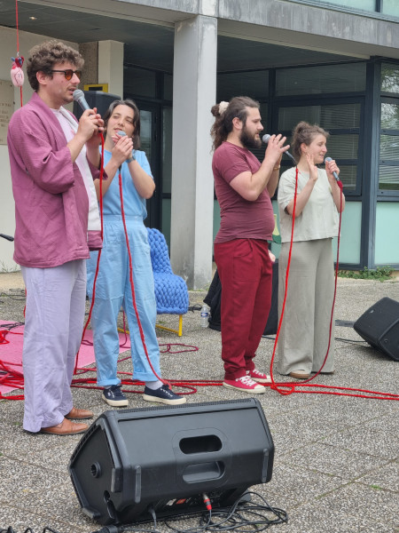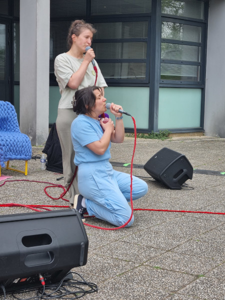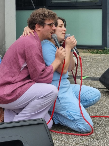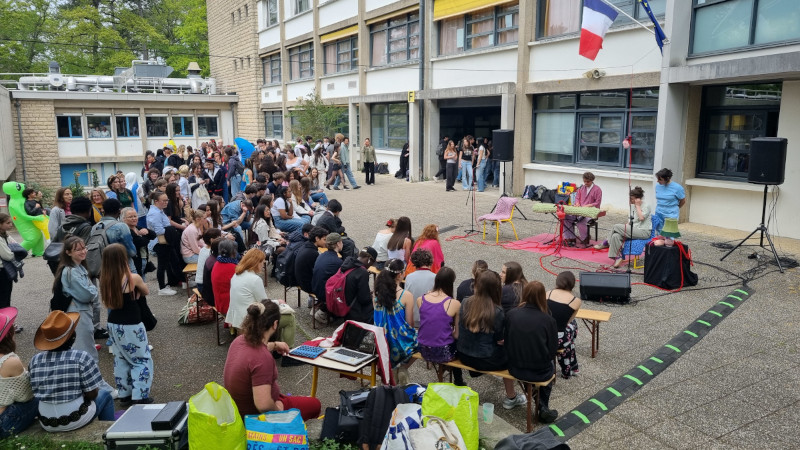 Sur le parvis, l’espace familier du lycée s’est transformé en lieu de performance. Sans dispositif scénique imposant, les artistes ont investi le lieu en s’appuyant principalement sur la parole, le mouvement et l’interaction. Le format, volontairement direct, a favorisé une proximité avec le public, composé d’élèves et de membres de la communauté éducative.