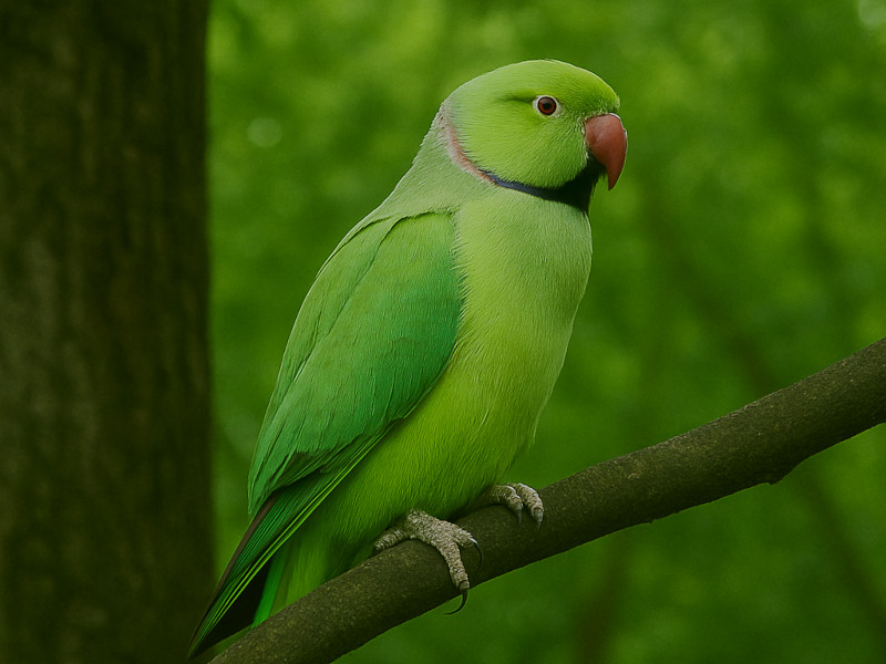 L’élégante invitée de passage ? Une perruche à collier (Psittacula krameri), à la silhouette vive et au plumage vert éclatant.